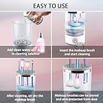 [Multi-function makeup brush cleaner] There are 2 cleaning modes: automatic and handheld. Just add water and cleaning solution, and do not add more than the maximum water level. Three brushes can be placed in one cleaning. After deep cleaning, flip the silicone sleeve to dry.The silicone lock on the top can also be stored and dried positively and positively, which is both an automatic makeup brush cleaner and a makeup brush storage box